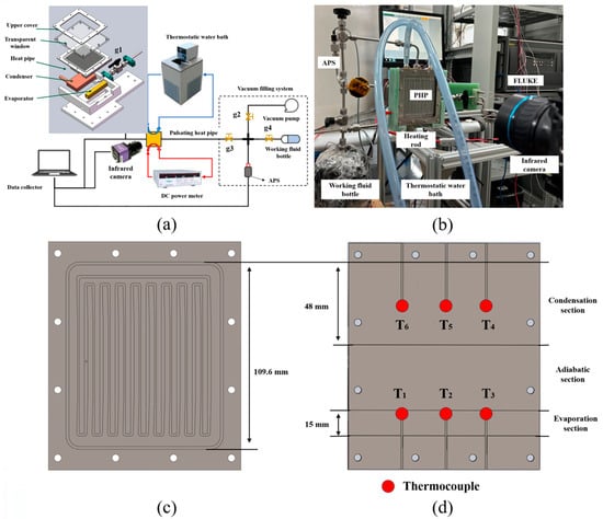 (a) Schematic diagram of test loop, (b) image of experimental apparatus, (c) schematic diagram of PHP, and (d) temperature distribution of thermocouple.