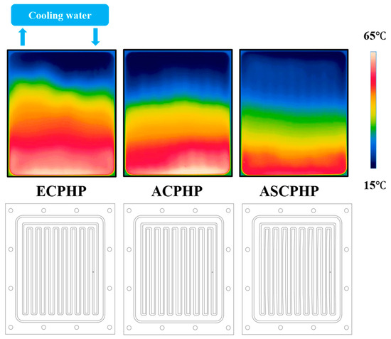 Figure 5 displays infrared photos depicting the temperature distribution on the different types of PHPs operating at 75 W heating power with a liquid FR of 40%. As evident from the infrared photos, the ASCPHP exhibited lower temperatures at corresponding positions, indicating superior heat transfer performance.