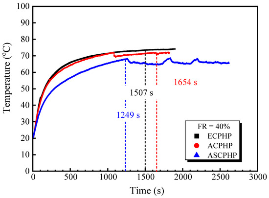 In Figure 7, the black, red, and blue curves correspond to the ECPHP, ACPHP, and ASCPHP, respectively. At a liquid FR of 40%, as depicted in Figure 7, both the ACPHP and ASCPHP exhibited noticeable temperature overheating followed by a subsequent decrease during startup. This phenomenon is termed the full startup of the PHP, indicating the occurrence of vapor–liquid slug oscillation in all channels. The ECPHP exhibited no significant temperature overshoot, gradually reaching thermal equilibrium at t = 1507 s, with the temperature stabilizing at approximately 74 °C. The ACPHP achieved full startup at 1654 s, maintaining a wall temperature of about 71 °C. The ASCPHP reached full startup in 1249 s, and thereafter, the wall temperature periodically fluctuated around 65 °C once it reached a thermal equilibrium state. The periodic temperature fluctuations observed in ASCPHP, which were a consequence of the pressure difference generated due to overheating, suggest that vapor–liquid slugs within ASCPHP had established a stable and unidirectional cycle within the PHP under high heating power conditions. Summarizing the findings in Figure 7, it is apparent that when subjected to high power, the ASCPHP with an FR of 40% outperformed the other two types of PHPs in startup characteristics, displaying both lower startup temperatures and shorter response times.