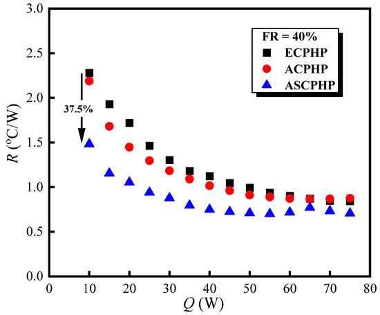 Thermal resistances of three types of PHPs with FR of 40%.
