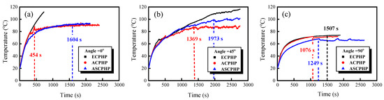 Start-up characteristics of three types of PHPs when placed at 0°, 45°, and 90° (Q = 70 W). (a) Temperature Curves for Three PHP Configurations at a 0° Inclination; (b) Temperature Curves for Three PHP Configurations at a 45° Inclination; (c) Temperature Curves for Three PHP Configurations at a 90° Inclination.