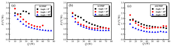 The thermal resistance was determined according to Equation (7). Here, and are the temperature of the evaporation section and condensation section, respectively. is the heat load of the heating rod.