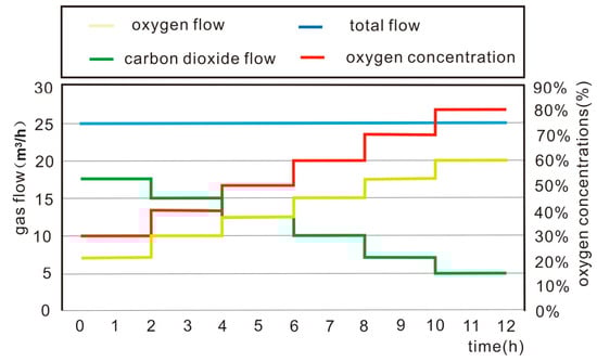 In this experiment, oxygen-enriched carbon dioxide was used as the gasification agent. The volume fraction of oxygen and carbon dioxide was adjusted with the same total injection rate. Under the same condition, we investigate to the composition of the gas generated by the corresponding gasification process and the pattern of changes in the result under different oxygen and carbon ratios. Compared with the conventional oxygen-enriched coal UCG process, the main significant difference of the oxygen-enriched carbon dioxide UCG process is the addition of CO2 to the conventional oxygen-enriched gasification agent, which not only changes the balance of the three-zone reaction in the gasification zone but also promotes the reduction reaction, which in turn affects the gas composition of the gasification product. The variation in the experimental gasification agent injection flow rate is shown in Figure 3. The total gasification agent injection flow rate was 25 m3/h, and six kinds of oxygen-rich carbon gasification agents with different oxygen-to-carbon ratios with oxygen concentrations of 30%, 40%, 50%, 60%, 70%, and 80% were used for the gasification experiment. These gasification agents were utilized in sequence for 2 h, and the total length of the experiment was 12 h.