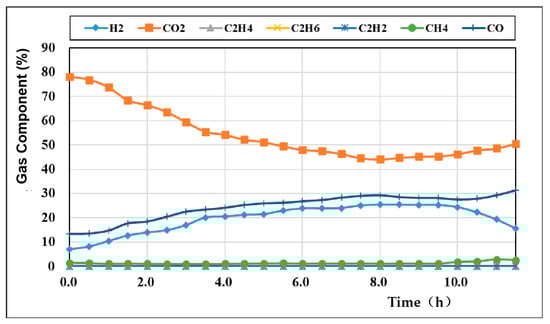 The content of each component of the gas produced by oxygen-enriched carbon dioxide gasification is shown in Figure 4. The main gas components of the gasification coal gas included H2, CO, CH4, and CO2. With increasing oxygen concentration injected by the gasification agent, the CO2 content gradually decreased from 78.09% and reached its lowest value at approximately 8 h, at which time the CO content in the generated gas also reached its peak value of 29.73%. The H2 content reached its peak value of 27.63% at approximately 8.5 h, and the CH4 content was relatively stable without obvious fluctuations.