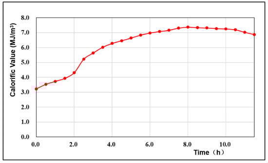 The calorific value is an index for measuring the quality of the produced gas, and it also indirectly reflects the quality of the gasification effect []. The change in the calorific value of the gas produced in this experiment is shown in Figure 5. The average calorific value was 6.17 MJ/m3. During the initial period of this stage (oxygen concentration of 30%), the calorific value of the generated gas began to increase slowly, rising from 3.23 MJ/m3 to 4.32 MJ/m3 within 2 h. At 2 h, the oxygen concentration of the injected gasification agent was adjusted to 40%, and the calorific value of the generated gas began to rise rapidly, increasing by 1.96 MJ/m3 over 2 h, and increased nearly twice as much as that under the gasification condition of 30% oxygen concentration. In the subsequent 4 h gasification process, with increasing oxygen concentration, the calorific value of the generated gas also increased continuously, but the rate of increase gradually decreased. When the O2 concentration in the gasification agent component reached 60%, the flow of the combustible gas in the generated gas reached its peak value. At 8 h, the oxygen concentration changed from 60% to 70%, and the calorific value of the generated gas began to decrease slowly.