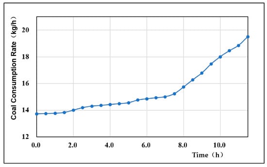 The coal consumption rate, as a basic variable for evaluating the gasification effect, directly reflects the coal consumption in the gasification process and indirectly reflects the coal gasification rate []. The overall coal consumption rate of the experiment fluctuated minimally, the coal consumption rate increased with time, and the average coal consumption rate was 15.46 kg/h (Figure 7). During the initial 2 h of the experiment, the coal consumption rate was stable at approximately 13.7 kg/h without a significant change, because in the early stage of the experiment, under 30% oxygen concentration gasification, the oxidation reaction was weak, the temperature field in the gasification zone was low, and the reaction intensity was low. At 2 h, the oxygen concentration of the gasification agent rose to 40%, the oxidation reaction in the gasification reaction began to increase in intensity, and the coal consumption rate began to rise slowly. In the subsequent gasification process, with the continuous increase in the injected oxygen concentration of the gasification agent, the oxidation reaction became increasingly intense, and the coal consumption per unit time also increased continuously. When the oxygen concentration of the gasification agent exceeded 70%, the coal consumption rate also increased correspondingly under gasification conditions with an excessively high oxygen concentration; thus, the coal consumption rate started to increase rapidly after 8 h.