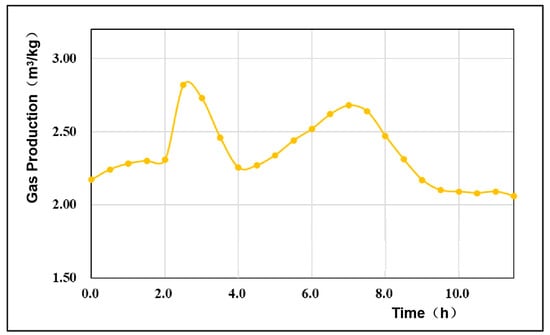 As an important index for evaluating the quality of UCG, the gas production per unit mass of coal can indirectly reflect the change trend of the gasification efficiency in the gasification process []. The gas production rate per unit mass of coal fluctuates but is generally in the range of 2–3 m3/kg. In this experiment, the average gas production rate of coal was 2.35 m3/kg. Figure 8 shows that at the initial stage of the reaction, since the oxygen concentration of the injected gasification agent was not high at this time, the oxidation reaction intensity was low, and the gas production per unit mass of coal was low. When the oxygen concentration of the injected gasification agent was adjusted to 40%, the gas production per unit mass of coal increased rapidly to a maximum value of 2.82 m3/kg and then began to decline due to the increase in the oxygen concentration of the gasification agent, which provided more oxygen for the oxidation reaction. As the oxidation reaction intensified, the temperature of the gasification zone increased, and the concentration of CO2 also increased, which further promoted the reduction reaction. As the reduction reaction intensity increased, the temperature field in the gasification zone became increasingly low and could not provide the temperature environment required for the reduction reaction, which in turn promoted the intensification of the oxidation reaction. Thus, the gas production per unit mass of coal declined. Therefore, in the gasification process, there is a cyclic process in which the gas production initially increases, then decreases, and finally increases again.