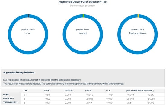 - Check dependent variable stationarity using residual analysis and Augmented Dickey–Fuller test. The Augmented Dickey–Fuller test (ADF Test) checks the null hypothesis of a series as stationaryADF Test checks if . If so, then is a random walk. It is a stationary process if −1 < 1 + < 1. This test helps us to determine integration (d and D) parameters. Figure 3 shows the Augmented Dickey–Fuller Test applied to the Hourly Production kWh. In this case, the natural series is stationary. The same experiment applied to Daily Production kWh data showed non-stationarity and the need to integrate with one difference to make it stationary.