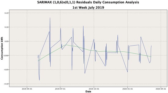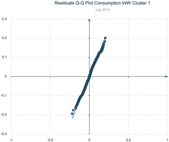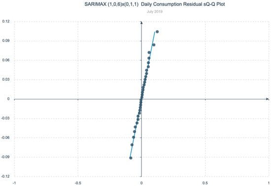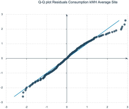 - Residual Normality VisualizationThe Q-Q Plot is utilized to test Normality in Residuals of selected forecasting models. The Q-Q plot for Consumption kWh residual is presented in Figure 5. The Quantile–Quantile Plot helps us to compare two distributions. In the Figure, the points represent the residual quantile distribution, while the straight line/45º reference line represents the standard normal distribution. If the quantile distribution points follow a straight line, the time series is normally distributed. In our case, that means the model residuals are normally distributed.
