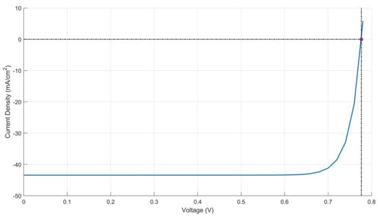 The maximum power voltage (Vmp) was 503.559 mV, the maximum power current (Jmp) was 48.8075 mA/cm2, the short-circuit current (Jsc) was 51.8738 mA/cm2, and the open-circuit voltage (Voc) was 637.552 mV. Table 2 clarifies the comparison of our proposed solar cell structure with previous works.