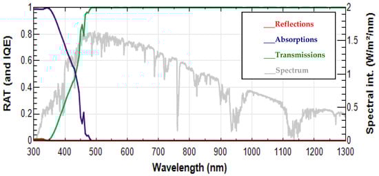 Figure 9 illustrates the reflections, absorptions, transmissions, and spectral intensities against the spectral wavelengths, and this was determined through the use of an optimum ZnS absorber layer thickness via OPAL 2 solar cell simulation. The total incident photo-current density through a ZnS absorber layer was 51.88 mA/cm2, the photo-absorbed current in a ZnS film was 0.48 mA/cm2, and the photo-absorbed current in the substrate was 51.41 mA/cm2.
