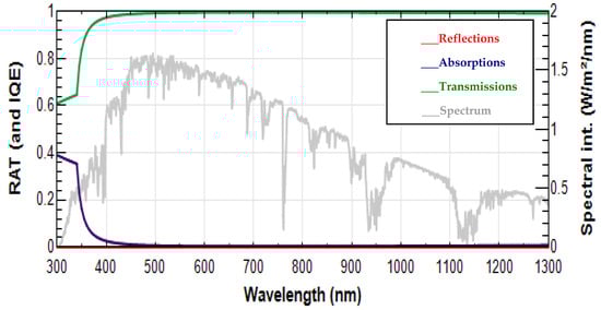 Figure 11 indicates the reflections, absorptions, transmissions, and spectral intensities against the spectral wavelengths through the use of an optimum ZnO:Al absorber layer thickness via OPAL 2 solar cell simulation. The total incident photo-current density through a ZnO:Al absorber layer was 51.88 mA/cm2, the photo-absorbed current in a ZnO:Al film was 1.06 mA/cm2, and the photo-absorbed current in the substrate was 50.82 mA/cm2.