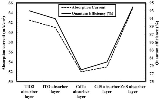 Figure 15 clarifies the substrate absorption current and quantum efficiency versus the different absorber layer structures. The substrate absorption current and quantum efficiency were 62.5 mA/cm2 and 93%, respectively, in the case of the TiO2 absorber layer. The substrate absorption current and quantum efficiency were 61 mA/cm2 and 91%, respectively, in the case of the ITO absorber layer. The substrate absorption current and quantum efficiency were 52 mA/cm2 and 78%, respectively, in the case of the CdTe absorber layer. The substrate absorption current and quantum efficiency were 52 mA/cm2 and 78%, respectively, in the case of the CdTe absorber layer. The substrate absorption current and quantum efficiency were 53 mA/cm2 and 80%, respectively, in the case of the CdS absorber layer.