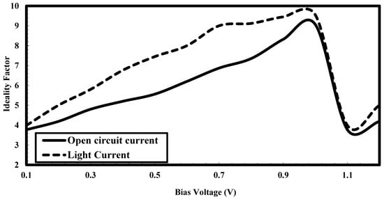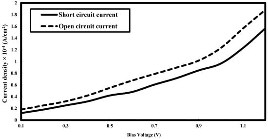 Figure 18 shows the solar cell photo-current density versus the bias voltage variations. The solar cell photo-current density was 0.12 mA/cm2 in the short circuit case at a bias voltage of 0.1 Volt, and its value was 0.18 mA/cm2 in the open-circuit case at a bias voltage of 0.1 Volt. The solar cell photo-current density was 0.42 mA/cm2 in the short-circuit case at a bias voltage of 0.5 Volt, and its value was 0.55 mA/cm2 in the open-circuit case at a bias voltage of 0.5 Volt. The solar cell photo-current density was 0.835 mA/cm2 in the short-circuit case at a bias voltage of 0.9 Volt, and its value was 1.023 mA/cm2 in the open-circuit case at a bias voltage of 0.9 Volt. The solar cell photo-current density was 1.563 mA/cm2 in the short-circuit case at a bias voltage of 1.1 Volt, and its value was 1.892 mA/cm2 in the open-circuit case at a bias voltage of 1.1 Volt.