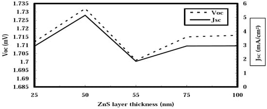 The short-circuit current density/open-circuit voltage of the solar cell structure for the various ZnS absorber layer thicknesses.