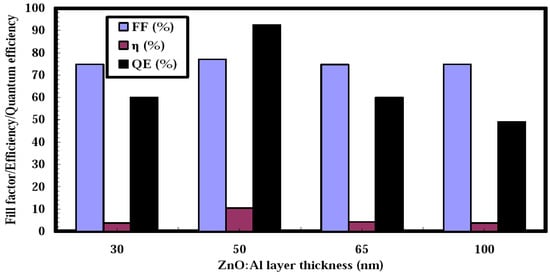 The fill factor, power conversion efficiency, and quantum efficiency of the solar cell structure for the various ZnO:Al absorber layer thicknesses.