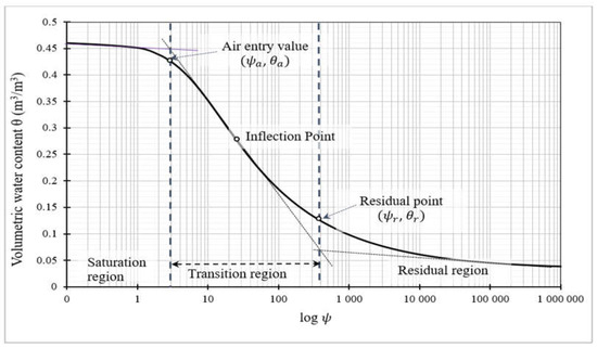 where [m−1] is a fitting parameter equal to the inverse of the bubbling pressure or suction/pressure head at air entry and is a dimensionless fitting parameter related to the particle size distribution of the medium. At , the relationship between and is [25]. Suction or pressure head at air entry is a unique parameter of the medium that can be read off from the SWRC and represents the pressure where the largest pore begins to drain [26].