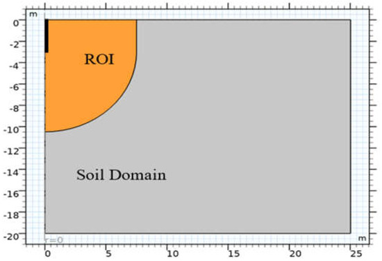 The geometric model of the vertical earth rod in homogeneous soil is built using the 2D axisymmetric space of the Model builder of the software. Leveraging on the vertical radial symmetry of cylindrical rod and ground enables the geometric model of the earth rod to be built with the 2D axisymmetric space of the software [40]. Unlike the 3D model equivalent, the 2D results in reduced meshing and computational costs. For a cylindrical rod of length 3 m and radius 9.525 mm, the width and depth of the homogeneous soil domain are 25 m and 20 m, respectively, as shown in Figure 2. The model shows a critical space around the earth electrode called the region of influence (ROI) of the earth electrode. Also referred to as the sphere of influence, the ROI is the region around the electrode where the energy dissipated from the earth electrode is significant. The volume of the ROI depends on the physical shape and size of the earthing electrode [41]. For a vertical earth rod of length , the ROI is bounded by the space 2.5 L from the surface of the rod [42].