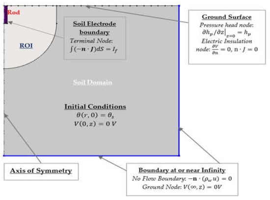 To demonstrate the capacity of the proposed hydro-geoelectric method in predicting the resistance and performance of earthing systems under variable conditions of soil, a simulation model of vertical earth rods in homogeneous soil was built in COMSOL Multiphysics software. Within the model builder, 1D–3D geometric models of an object can be created, discretized/meshed, and parameters and numerical solvers assigned for solving the governing equations over the discretized space. The software also enables probes and post-simulation analysis that may be presented in tables and annotated plots.