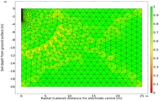 Actual dimensions and properties of solid cylindrical earth rods were used, while the hydraulic and electrical parameters of the three homogeneous soils (sandy, clayey, and silty soils) were sourced from references [35,38,39]. Using appropriate initial and boundary conditions, the partial differential equations governing the physics of electric and water flows were solved numerically using the finite element method (FEM) for different degrees of soil saturation. The influence of atmospheric conditions on the soil was modelled as soil suction on the ground surface. For the range of soil suctions, the soil water content or degree of saturation and corresponding resistivity of soil are determined at equilibrated suction values. Earthing resistance is subsequently computed from post-simulation analysis using the electric potentials at any soil boundary relative to the electric potential at the surface of the electrode. To validate the simulation model, resistance evaluated from post-simulation analysis is compared to resistance computed using existing analytical formulas in the literature.