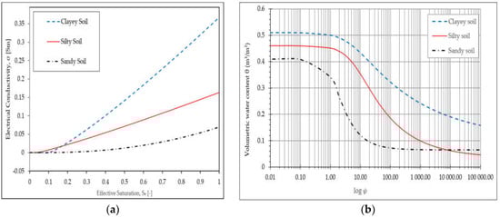 (a) Graph of electrical conductivity against effective saturation plotted using equations from [35]. (b) Soil water retention curve for clayey, silty, and sandy loam soils plotted with data from [38,39].
