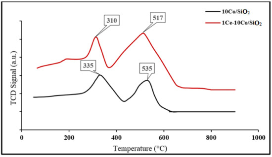 Accordingly, the H2-TPR results show that the chosen conditions (5 vol. % H2, flow rate of 30 m/min, and a duration of 12 h) are suitable for reducing Co3O4 to Co metal prior to the beginning of FTR.