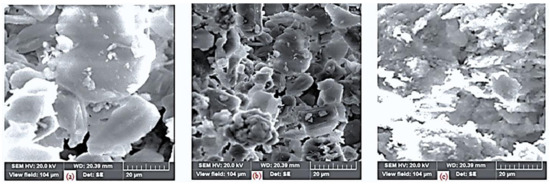A comprehensive scanning electron microscope (SEM) study was conducted to examine the morphological changes of the catalysts and their precursors at different stages: before and after the test. The SEM images captured during the analysis are presented in Figure 4. Notably, distinct differences were observed in the morphology of the catalyst precursor (Figure 4a) and the calcined catalyst (Figure 4b). The electron micrograph of the catalyst precursor displayed numerous agglomerates of particles, indicating a less dense structure. However, after calcination at 600 °C, the morphology significantly transformed, with reduced agglomeration evident in the calcined catalyst (Figure 4b). This transformation was attributed to the coverage of the calcined catalyst surface with small crystallites of cobalt and cerium oxide [41]. Moreover, following the Fischer–Tropsch synthesis (FTS) chemical reaction, the catalyst underwent further changes in texture and morphology (Figure 4c). Notably, the grain size of the tested catalyst increased, primarily due to agglomeration resulting from sintering after the reactions. These SEM observations provided valuable insights into the structural modifications and behavior of the catalysts during the various stages of the study.