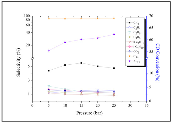Based on thermodynamic principles, increasing the total pressure of the reaction unit shifts the equilibrium reactions towards the products, leading to an increase in reactant conversion. Therefore, the effect of total pressure on the activity of the catalyst and the product selectivity was investigated and presented in Figure 6. The results indicate that the conversion of CO and the formation of desired products (C5+) increased by about 58.9% and 2.1%, respectively, when the total pressure was increased from 5 to 25 bar. On the other hand, the selectivity of lower chain hydrocarbons and CO2 decreased, which is consistent with an increase in chain growth probability with increasing pressure [44]. Using the outcomes of these trials, it can be said that high pressure (25 bar) is the optimal choice for producing liquid biofuel products (C5+) in the range of reaction pressures tested (5–25 bar), with a reaction temperature of 200 °C, a space velocity of 1000 mL/gcat·h, and an inlet feed ratio of 0.5 (H2/CO).