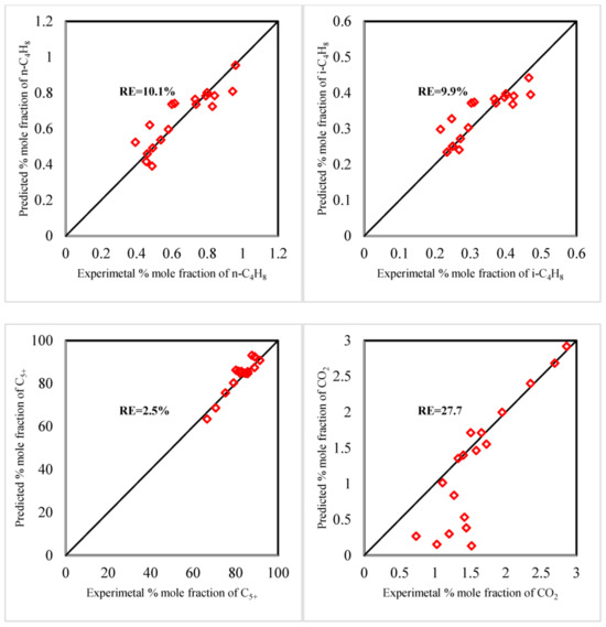 The procedure for estimating kinetic parameters depends on minimizing the mean absolute relative error (MARE) obtained between the experimental and predicted results. The genetic optimization method initially generates a number of chromosomes, with each chromosome representing a different set of kinetic parameters. Each chromosome is evaluated by applying its kinetic parameters in a mathematical model to simulate the response corresponding to sixteen experiments and predict the MARE for each one of these chromosomes. The optimization process continues until the MARE reaches its minimal value, and this chromosome represents the optimum kinetic parameters. The parity plot for the comparison of the experimental data from 16 experiments with the expected findings for CO, CH4, C2H4, C2H6, C3H8, n-C4H10, i-C4H10, C5+, and CO2 is shown in Figure 9. The simulation results at the optimum kinetic parameters are also shown in Table 4. Bench assesses the accuracy of the fitted model by utilizing a quantitative analysis approach and the MARE (11.7%) to compare the acquired results by the fitted model with those estimated by experiments (Table 3), with respect to CO conversion and product selectivity. The good accuracy of the fitted model is in comparison with the values reported by [1] (23.1%); [49] (20%); and [50] (48.4%). The minimum error is recognized for C5+ (MARE = 2.5%), while the maximum error obtained is for remaining CO (MARE = 27.7%). These confirm that the modified model accurately estimates the production rate of liquid biofuels (C5+). The MARE for CO is relatively higher than that for other components because the conversion of CO is high, and the remaining quantities of CO in the reactor effluent are too low. Therefore, higher levels of relative errors occur when comparing the experimental CO concentrations with the predicted CO concentrations in the reactor effluent. The modeling results agree very well with the experimental data, especially in predicting C5+ selectivity.