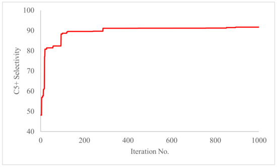 Table 6 lists the outcomes of genetic optimization, and (Figure 10) shows how the objective function changes as the number of iterations increases (generation number). After the highest possible generation count (1000) is achieved, the optimizer ends. At these operating conditions: 200 °C temperature, 6.29 bar reactor total pressure, 1529.58 mL/gcat·h space velocity, and a H2/CO feed ratio of 3.96, the maximum C5+ selectivity was achieved at 91.66.