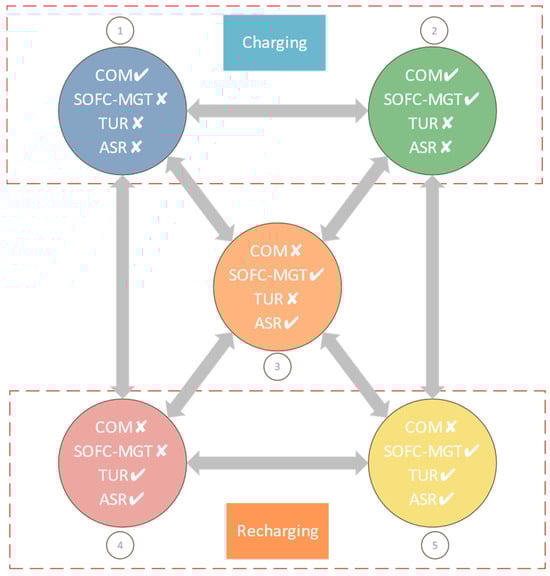 Working states of the CAES-SOFC/MGT hybrid system. (COM: Compressors of CAES; SOFC-MGT: Solid oxide fuel cell and Micro gas turbine; TUR: Turbines of CAES; ASR: Air storage reservoir; Check mark: Subsystem is running; Cross mark: Subsystem is not running).