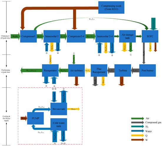 The working process of the integrated system used for this work can be seen in Figure 1. Firstly, it is assumed that the SOFC-MGT system consistently operates as the base load. In case of peak load, the compressors utilize surplus electricity generated from renewable sources to compress air into the storage tank in the charging mode. The intercooling heat exchangers transfer the heat to a hot water tank.
