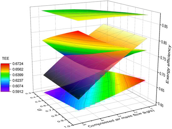 where and are the air-specific enthalpy at the inlet and outlet of the interstage cooler, respectively; and are the specific enthalpy of the water in the heat storage system at the inlet and outlet of the interstage cooler, respectively; is the thermal conductivity of the heat exchanger; is the heat transfer area; and is the average temperature difference between air and water.