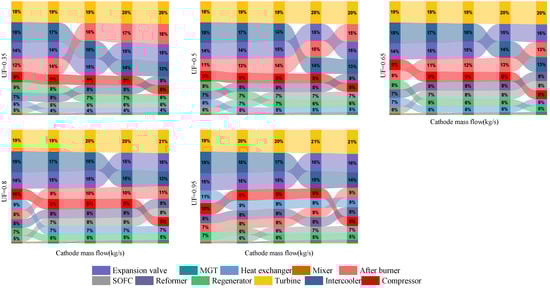 State 5 characterizes the standard energy release state and corresponds to the system’s maximum output power. In this state, the compressed air in the air tank is split into two streams, of which one stream directly drives the air turbine to generate electricity, while the other stream serves as the anode inlet air for the SOFC-MGT system. Unlike state 4, the high-temperature exhaust gas at the outlet of the SOFC-MGT system heats the inlet air of the first-stage air turbine, allowing for the full utilization of the waste heat from the exhaust gas.