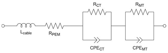 Measurements were conducted in a commercial test cell setup (balticFuelCells GmBH, Schwerin, Germany) at 80 °C cell temperature and 100% relative humidity. The gas inlet temperature was 85 °C to prevent condensation. All gases used (AirLiquide Alphagas, Paris, France) had a purity higher than 99.99%. Measurements were conducted using a PP242 power potentiostat coupled with a Zennium Pro workstation (Zahner-elektrik GmbH & Co. KG, Kronach, Germany). The measurement protocol is summarized in Table 2. First, the ECSA was determined similarly to the RDE before conditioning. Afterwards, the MEA was conditioned based on the protocol by Grandi et al. [33] via potential cycling, as demonstrated in Figure S3. Each potential step was held for 60 s. After conditioning, CVs were performed again to determine the improvement in the ECSA from conditioning. The individual cell resistances were determined via electrochemical impedance spectroscopy (EIS). At each recorded current density step, an amplitude, a (mA/cm2), of 10% of i and frequencies, f (Hz), from 1 kHz to 300 mHz were applied. An equivalent circuit based on the work of Santana et al. [40] as well as Ferreira et al. [41], shown in Figure 1, was simulated by Zahner Analysis 3.2.0. This equivalent circuit consists of an inductive coil for the cables from the cell to the potentiostat (Lcable), a membrane resistance (RPEM) and two parallel circuits in series with each a resistance (R) and constant phase element (CPE) for charge transfer (CT) and mass transfer (MT) impedance. Lastly, a polarization curve was recorded under similar conditions as during the EIS measurement in galvanostatic mode and with stoichiometric gas flows (stoichiometry λ [-]).