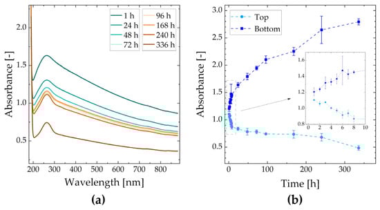 The sedimentation behavior of the catalyst ink can be seen in Figure 2. In Figure 2a, the recorded spectrum of samples extracted from the top of the ink is shown. The acquired absorbance at 600 nm over a storage time of two weeks (336 h) for samples taken from the top and bottom of the ink is demonstrated in Figure 2b. The particle concentration decreased at the top of the ink, where it more than halved, while it increased at the bottom with a doubling over the experimental time. A low standard deviation indicates the reproducibility of the measurements.