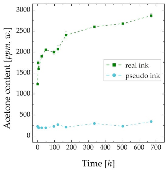 Measured concentration of acetone as degradation product in real and pseudo catalyst ink over a storage time of 4 weeks (672 h); pure solvent: 21.94 ± 0.5 ppm, w.