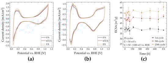 CVs for conditioning during RDE measurements; first cycle for RDE-0, -672 and –EX (a); last cycle for RDE-0, -672, and –EX (b); ECSA of first, 9th and 25th (last) conditioning cycle over the catalyst ink storage time including EX (c).