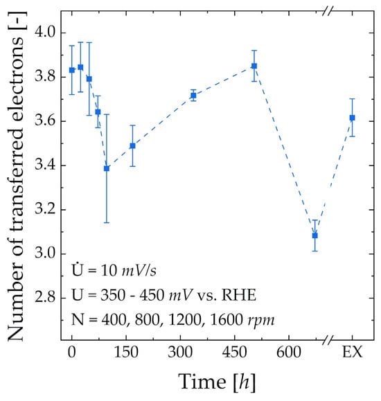 Evolution of number of transferred electrons from Koutecky–Levich analysis (RDE) over catalyst ink storage time.
