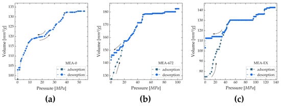 Adsorption and desorption isotherms of MEA-0 (a), MEA-672 (b) and MEA-EX (c) recorded via Hg intrusion porosimetry.