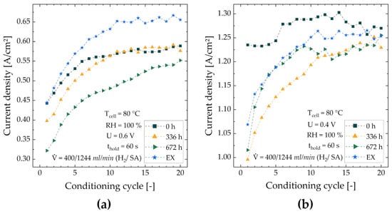 Current density evolution during the conditioning process of MEA-0, -336, -672 and -EX at 0.6 V (a) and 0.4 V (b) (mean over the holding time of each voltage step).
