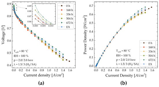 Conditioning—The mean current densities during conditioning at 0.6 V and 0.4 V for four representative MEAs (MEA-0, -336, -672, -EX) are shown in Figure 8a,b, respectively. The results for all MEAs can be found in Figure S5. As expected, the current densities for all MEAs increase during the conditioning procedure, and a plateau is reached by its end. However, the relative improvements between the MEAs differ significantly, as shown in Table 4. The lowest and highest relative current increase is observed for MEA-0 and MEA-672, respectively. At 0.6 V, a steady increase in the relative improvement and decrease in the current density within the first conditioning loop with increasing ink storage duration are visible. After the last cycle, MEA-336 and MEA-672 perform similarly to MEA-0, whereas MEA-672 appears not to have reached its maximum yet. For MEA-EX, the initial current density is similar to MEA-0, but the final current density is approx. 11% higher. At 0.4 V, MEA-0 has almost reached its final performance within the first six cycles, while all other MEAs show a sharp performance increase, especially MEA-672, within the first ten to eleven cycles. The highest performance was reached by MEA-0, whereas it should be noted that all cells show a comparable performance after the last cycle.
