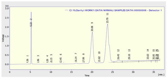 In order to prepare ternary blends, palm oil was procured in the required quantities from the local market and sent to the Biofuels Lab at the Center for Waste Management at the Sathyabama Institute of Science and Technology, India. In this study, raw palm oil is converted into biodiesel using the transesterification process. The process parameters for raw palm oil to biodiesel conversion are reported in Table 1. Before studying the physiochemical properties, the biodiesel composition analysis was performed using a Gas Chromatography-Flame Ionization Detection (GC-FID) instrument available at the same facility. The assessment results are illustrated in Figure 1, with their respective identified compound names reported in Table 2. Once the processed palm biodiesel was received from the biofuel lab, other fuels such as ethanol, propanol, and diesel required for the test were procured from local suppliers. Then the blends were prepared in various volumetric concentrations and later tested for their physiochemical properties. Furthermore, the values of kinematic viscosity (KV) and CN for binary and ternary blends were calculated using the Kay mixing rule [45] and are indicated using the * symbol. The data is tabulated in Table 3 and Table 4, respectively.