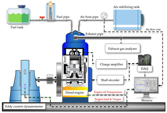Once the required reference fuels and ternary fuel blends were prepared, the experiments on a constant-speed CI engine were carried out at a for-hire test facility located in Chennai, India. First, the engine was cranked with diesel fuel and allowed to run until it reached a steady operating temperature. Then the dynamometer load was incrementally increased until the 100% engine loading capacity was reached. Once the engine attained steady state conditions, the test readings were documented for various performance, combustion, and emission characteristics, such as engine load, engine speed, airflow rate, fuel flow rate, in-cylinder pressure, NOX, HC, CO, and SM. The average in-cylinder pressure crank angle data was processed from a dataset of 100 consecutive cycles retrieved using a data acquisition system. The same procedure was repeated for other test fuels. The technical specifications of the test engine are provided in Table 5, and a schematic of the test setup is presented in Figure 2. The experimental conditions, calibration, and environment can all lead to errors. In order to confirm the dependability of experiments, defining uncertainty is essential. The uncertainty calculation presented in Equation (1) is based on methodology developed by Kline [48].