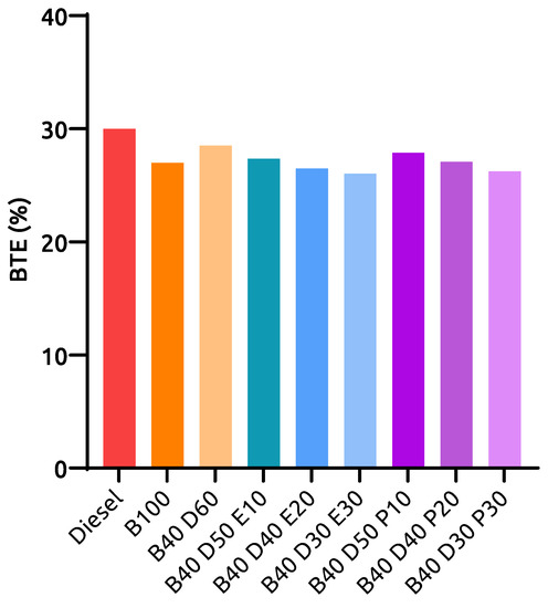 The BTE obtained for all tested fuels at 100% engine loading is illustrated in Figure 3. It can be inferred that BTE for reference fuels such as diesel, B100, and B40D60 is 29.9%, 26.7%, and 28.5%, respectively. The ethanol-based ternary blends such as B40D50E10, B40D40E20, and B40D30E30 attained 27.3%, 26.4%, and 26%, respectively, whereas propanol-based ternary blends such as B40D50P10, B40D40P20, and B40D30P30 attained 27.8%, 27%, and 26.2%, respectively. Compared to diesel, all other fuels score lower in terms of BTE. The presence of diesel in the B40D50 binary blend raises its BTE by 1.8%. In addition, with ternary blends, the increasing volumetric presence of alcohols such as ethanol and propanol in their respective blends results in decreasing BTE values. These characteristics can be attributed to the CV of tested fuels [50,51]. Overall, B40D30E30 and B40D30P30 blends saw the highest decline among the tested fuels in BTE, and in comparison to diesel, the drop was estimated at 3.9% and 3.7%, respectively. Other ternary blends, such as B40D50P10, B40D40P20, B40D50E10, and B40D40E20, saw similar drops in BTE values of 2.1%, 2.9%, 2.6%, and 3.5%, respectively, when compared to diesel. Similar observations were also seen by Satish et al. [27] and Kulanthaivel et al. [26] in their experiments using ternary blends.