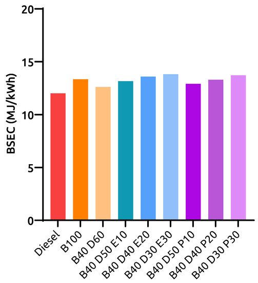 Figure 4 depicts BSEC data for all tested fuels at 100% engine loading condition. The BSEC is a better indicator than BSFC [52], as it accounts for the CV of the respective fuel along with fuel consumed, as the tested engine is designed for governor-controlled constant speed operation. Typically, as the engine load increases, the engine speed decreases equally. Here, the governor releases more fuel to maintain the desired engine speed. As diesel has the highest CV, it releases more heat energy per volumetric unit of fuel when compared to other tested fuels. Thus, the engine consumes less diesel fuel. The BSEC values are 12.1 MJ/kWh, 13.3 MJ/kWh, and 12.6 MJ/kWh for diesel, B100, and B40D60, respectively. The obtained values for propanol-based ternary blends B40D50P10, B40D40P20, and B40D30P30 are 12.9 MJ/kWh, 13.3 MJ/kWh, and 13.7 MJ/kWh, respectively. Meanwhile, 13.1 MJ/kWh, 13.5 MJ/kWh, and 13.8 MJ/kWh were noted for the ethanol-based ternary blends B40D50E10, B40D40E20, and B40D30E30, respectively. In a comparative perspective among the tested fuels, engine operation with the fuel blend containing the highest alcohol concentration consumed more energy. In relation to the B40D60 binary blend, it is calculated to be about an increase of 1.2 MJ/kWh and 1.1 MJ/kWh for B40D30E30 and B40D30P30, respectively. On the other hand, a similar increase of 0.5 MJ/kWh, 0.9 MJ/kWh, 0.3 MJ/kWh, and 0.7 MJ/kWh was seen for blends B40D50E10, B40D40E20, B40D50P10, and B40D40P20 individually when compared to the B40D60 blend.