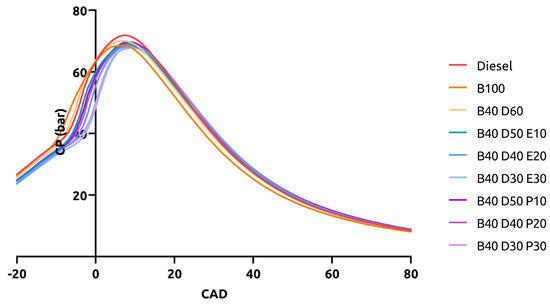 The CP recorded for all tested fuels at 100% engine loading is shown in Figure 5. The maximum CP for reference fuels diesel, B100, and B40D60 are 71.91 bars, 68.62 bars, and 70.1 bars, respectively. The ternary blends B40D50E10, B40D40E20, and B40D30E30 containing ethanol reported 69.29 bar, 68.42 bar, and 67.85 bar, respectively, while the propanol-based blends B40D50P10, B40D40P20, and B40D30P30 reported 69.80 bar, 68.88 bar, and 68.08 bar, respectively. In a comparative analysis among the tested fuels, the highest in-cylinder pressure was denoted for diesel-fueled engine operation. A drop in pressure of 3.29 bar and 1.81 bar was observed for B100 and B40D60, respectively. As earlier emphasized, the concentration of diesel raises the CV [53] of the binary blend, thus releasing more heat and subsequently raising the in-cylinder pressure slightly when compared to engine operation with B100. The results show that a 10% volumetric concentration of alcohol in both ethanol and propanol-based ternary blends gave rise to better in-cylinder pressure when compared to the other ternary blends. However, the values for B40D50E10 and B40D50P10 are slightly lower by 0.81 bar and 0.30 bar when compared to B40D60.