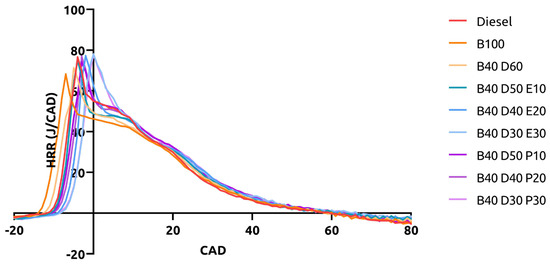 Figure 6 represents HRR results for all tested fuels at 100% engine loading condition. The maximum HRR values are 76.55 J/CAD, 68.21 J/CAD, and 71.3 J/CAD for diesel, B100, and B40D60, respectively. The 74.14 J/CAD, 76.94 J/CAD, and 77.93 J/CAD HRR values were observed for B40D50P10, B40D40P20, and B40D30P30 propanol-based ternary blends, respectively. Meanwhile, engine operation with the ethanol-containing blends B40D50E10, B40D40E20, and B40D30E30 gave 75.06 J/CAD, 77.25 J/CAD, and 78.46 J/CAD, respectively. Compared to reference fuels, a higher heat release rate was seen proportional to the alcohol concentration in the ternary fuel blends. Similar results were observed by Paul et al. [54]. This can be attributed to the higher oxygen content present in alcohols [55]. The delayed ignition in ternary blends allows for a better fuel-air mixture, which equips them for rapid combustion [56]. In contrast to the B40D60 binary blend, B40D50E10, B40D40E20, and B40D30E30 blends showed a raise of 3.76 J/CAD, 5.95 J/CAD, and 7.16 J/CAD, respectively, while an increase of 2.84 J/CAD, 5.64 J/CAD, and 6.63 J/CAD was observed for B40D50P10, B40D40P20, and B40D30P30 blends, respectively. Both B100 and B40D60 showed lower HRR values by 8.34 J/CAD and 5.25 J/CAD, respectively, when compared to diesel.