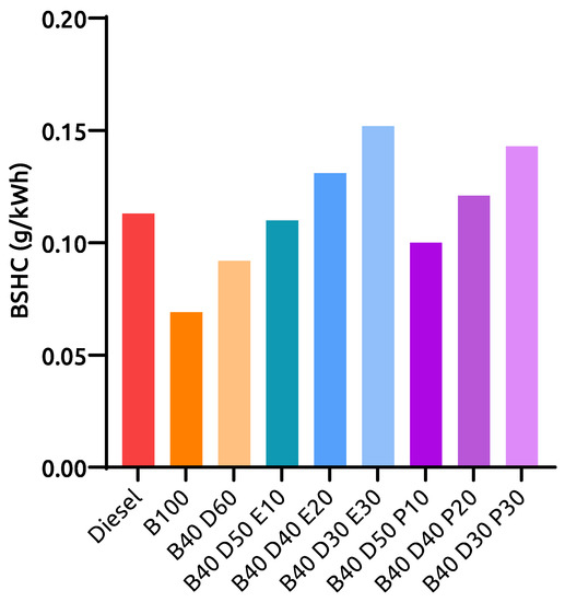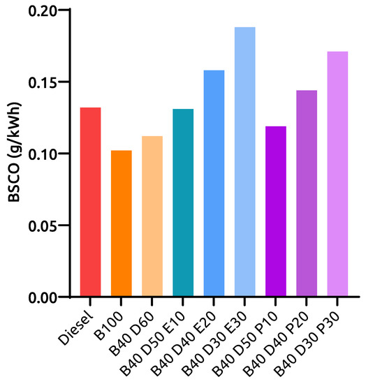 Figure 8 represents the BSHC results for all tested fuels at 100% engine loading condition. The BSHC values are 0.113 g/kWh, 0.069 g/kWh, and 0.092 g/kWh for diesel, B100, and B40D60, respectively. 0.100 g/kWh, 0.121 g/kWh, and 0.143 g/kWh of BSHC emissions were observed for B40D50P10, B40D40P20, and B40D30P30 propanol-based ternary blends, respectively. On the other hand, engine operation with the ethanol-containing blends B40D50E10, B40D40E20, and B40D30E30 gave 0.110 g/kWh, 0.131 g/kWh, and 0.152 g/kWh, respectively. When compared to B40D60 binary blend engine operation, B40D50E10, B40D40E20, and B40D30E30 blends showed a growth of 0.018 g/kWh, 0.039 g/kWh, and 0.060 g/kWh, while a rise of 0.008 g/kWh, 0.029 g/kWh, and 0.051 g/kWh was observed for B40D50P10, B40D40P20, and B40D30P30 blends. When compared to diesel, both B100 and B40D60 revealed lower BSHC values by 0.044 g/kWh and 0.021 g/kWh, respectively. The combined physiochemical properties of alcohols in ternary blends played a predominant role in HC emissions, which are observed to be higher than those of other tested fuels. Both ethanol and propanol possess an inferior CN, thus increasing the self-ignition period for ternary blends [23]. The higher latent heat of vaporisation in alcohol results in a lower cylinder temperature, while lower kinematic viscosity increases fuel-air mixture formation time. Zuo et al. [28] have indicated that these factors contribute to a leaner mixture, thus resulting in higher HC emissions with ternary blended engine operation.