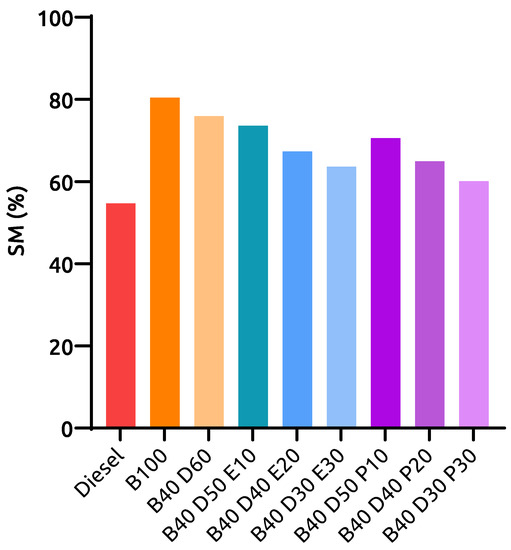 Figure 10 depicts SM data for all tested fuels at 100% engine loading. The SM values are 54.7%, 80.4%, and 75.9% for diesel, B100, and B40D60, respectively. The acquired values for propanol-based ternary blends B40D50P10, B40D40P20, and B40D30P30 are 70.6%, 64.9%, and 60.1%, respectively. Meanwhile, 73.6%, 67.3%, and 63.6% were stated for ethanol-based ternary blends B40D50E10, B40D40E20, and B40D30E30, respectively. When compared with B40D60 binary blend engine operation, B40D50E10, B40D40E20, and B40D30E30 blends presented a decrement of 2.3%, 8.6%, and 12.3%, respectively, while a lower value of 5.3%, 11%, and 15.8% was observed for B40D50P10, B40D40P20, and B40D30P30, respectively. When compared to diesel, both B100 and B40D60 revealed higher SM values by 25.7% and 21.2%, respectively. Prakash et al. [22] also observed similar results in their experiments and reported that lower SM values for ternary blends can be attributed to improved combustion brought about by the decreased viscosity and density of alcohol-containing fuel blends.